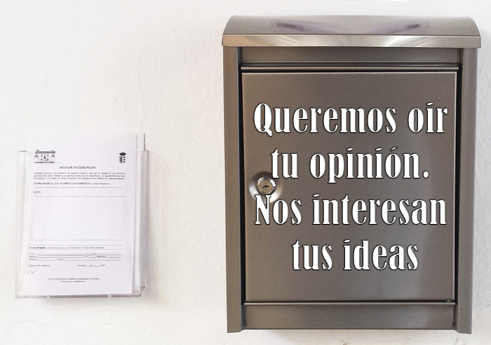 8 de enero de 2017, se pone a disposición de las vecinas/os de este municipio, una serie de buzones de sugerencias, con el objetivo de fomentar la participación ciudadana, además de mejorar la calidad de los servicios en los distintos centros e instalaciones a cargo de este Ayuntamiento. Las sugerencias serán recogidas mensualmente. Así mismo informarles que leeremos todas sus propuestas y tendremos en cuenta todas las ideas, que aporten mejoras positivas, para el máximo rendimiento y disfrute de las instalaciones municipales.