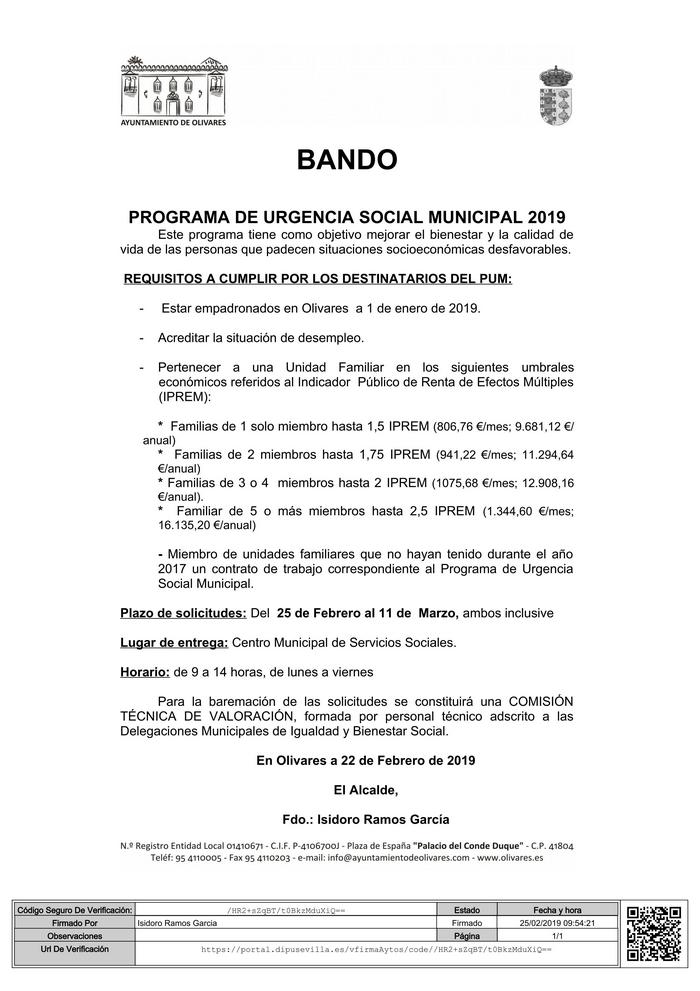 correspondiente al Programa de Urgencia Social Municipal.