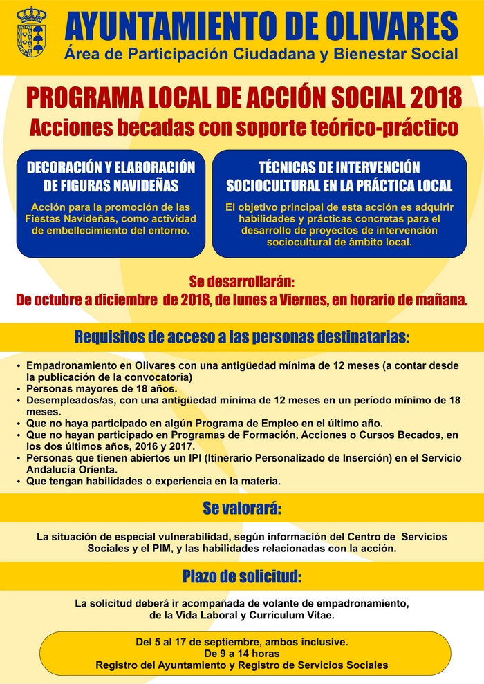 · Empadronamiento en Olivares con una antigüedad mínima de 12 meses (a contar desde la publicación de la convocatoria)