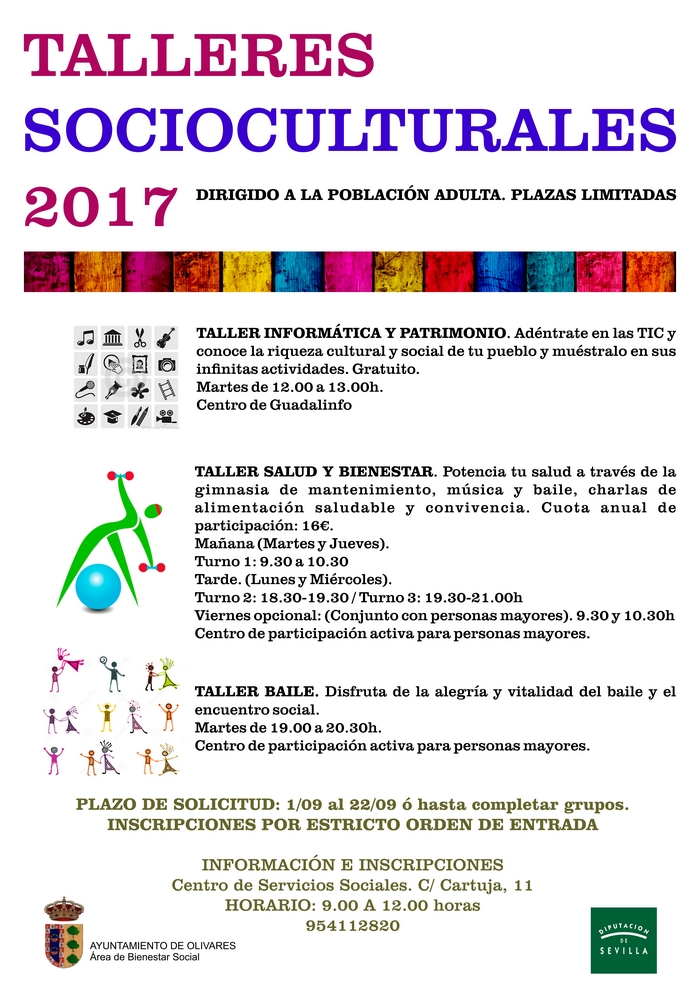 Para solicitar su participación en los talleres ofertados debe inscribirse en el Centro de Servicios Sociales, sito en C/ Cartuja, 11 en horario de 9.00 a 12.00h desde el 01/09 al 22/09 ambos inclusive, o hasta completar grupos.