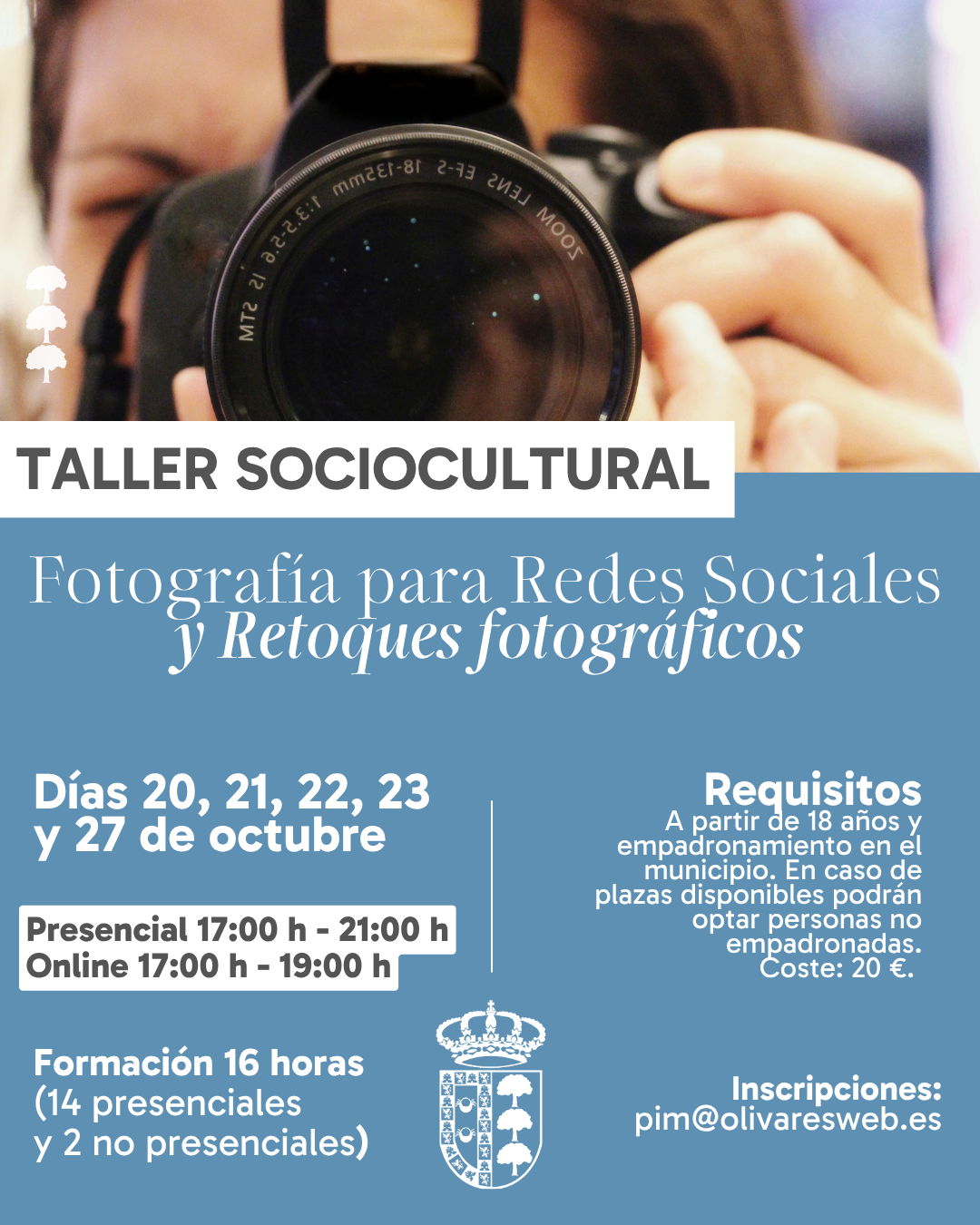 Desde el Ayuntamiento de Olivares también se ofrece el taller ‘Fotografía para Redes Sociales y Retoques Fotográficos’ los días 20, 21, 22, 23 y 27 de octubre, para aprender a capturar y editar imágenes atractivas que destaquen en sus publicaciones para redes sociales, combinando técnica y creatividad.