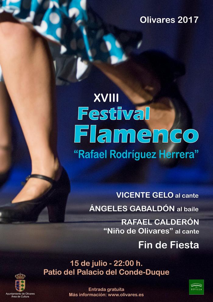 El sábado 15 de julio se celebra el XVIII Festival Flamenco "Rafael Rodríguez Herrera" de Olivares. Podremos disfrutar de una velada de cante y baile flamenco con Vicente Gelo al cante, Ángeles Gabaldón al baile y Rafael Calderón "Niño de Olivares" al cante.
