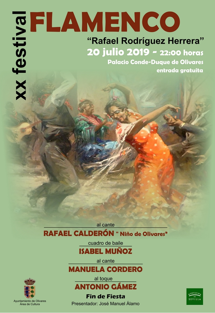 El sábado 20 de julio de 2019 a las 22 horas, tendrá lugar la XX Edición del Festival Flamenco de Olivares "Rafael Rodríguez Herrera". Lugar: Palacio del Conde Duque de Olivares. Entrada gratuita.