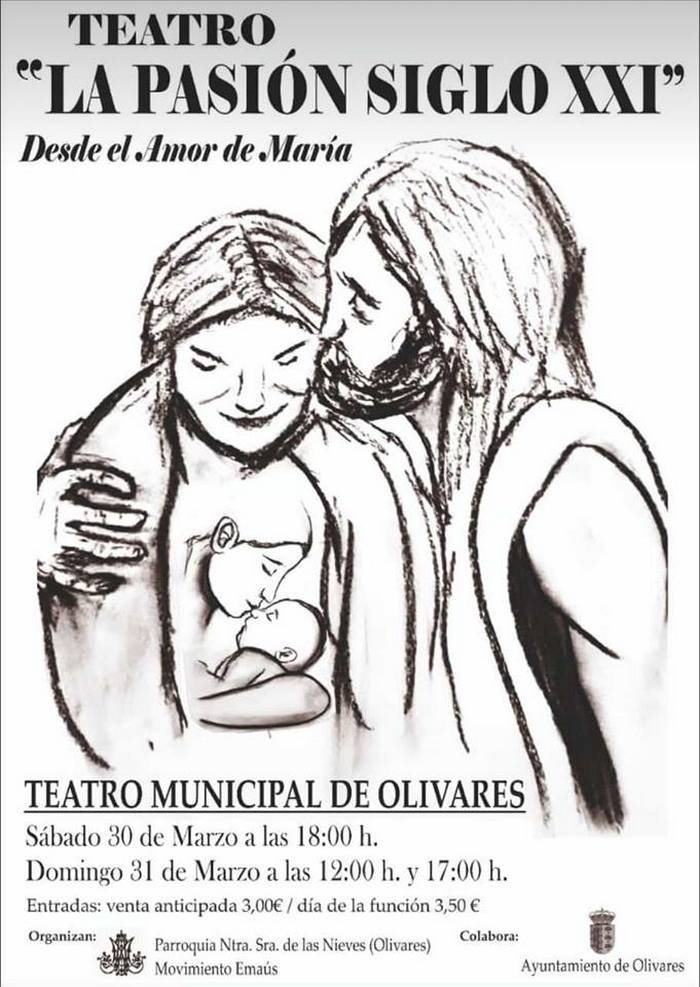 El día 30 de marzo a las 18 horas y el día 31 de marzo a las 12 y 17 horas se representará en el Teatro Municipal de Olivares "La Pasión Siglo S.XXI" Desde el Amor de María, organizada por la Parroquia Ntra Sra de las Nieves de Olivares y patrocinada por el Área de Cultura del Ayuntamiento de Olivares.