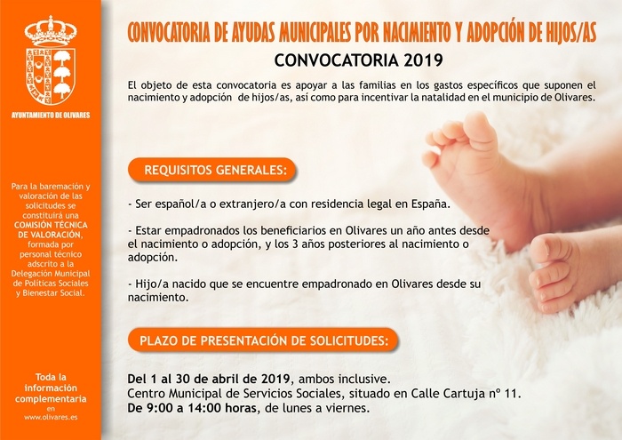 Mediante la presente convocatoria el Ayuntamiento de Olivares abre el plazo para la presentación de solicitudes de Ayudas Municipales por nacimiento y adopción de hijos/as, correspondiente al año 2019.