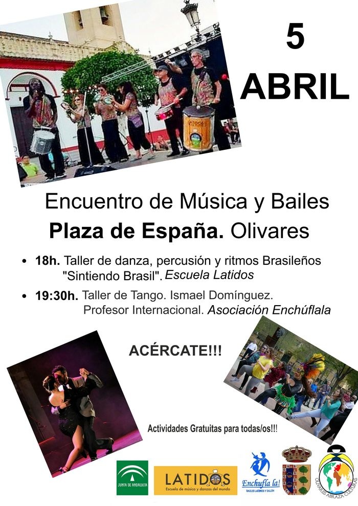 El próximo viernes 5 de abril la Plaza del España de Olivares acogerá el Encuentro de Músicas y Bailes del Mundo bajo el lema ?Olivares abraza Culturas? organizada por el Área de Bienestar Social del Ayuntamiento de Olivares con la Colaboración del Comité Dinamizador compuesto por: Espacio Joven, CPA Mayores, PDA Olivares, Sevilla Acoge, Escuela Latidos, Asociación Enchúflala, Asociación Surlatina, Asociación Saharaui.
