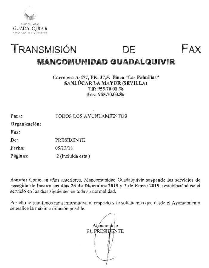 Como en años anteriores, la Mancomunidad "Guadalquivir", encargada de la prestación del servicio público de recogida de basura en todos los municipios de la comarca del Aljarafe, ha comunicado oficialmente a los Ayuntamientos afectados, que en las fiestas navideñas se suspende el servicio durante los días más señalados.