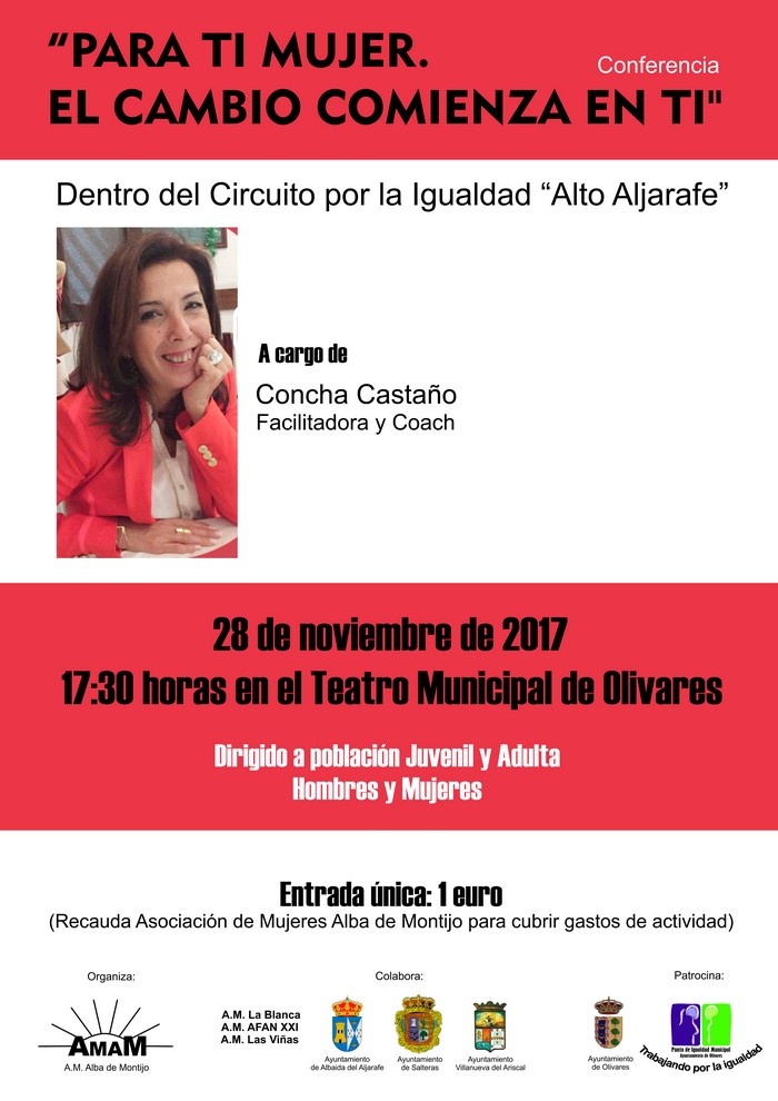 El próximo día 28 de Noviembre a las 17:30h, tendrá lugar la Conferencia: "Para ti mujer. El cambio comienza en ti", a cargo de Doña. Concha Castaño, Facilitadora y Coach, en el Teatro Municipal de Olivares. Una acción formativa que se enmarca en el Circuito Comarcal por la Igualdad "Alto del Aljarafe", en pro de la igualdad de oportunidades y la prevención de la violencia de género y que va destinada a la población juvenil y adulta, hombres y mujeres.