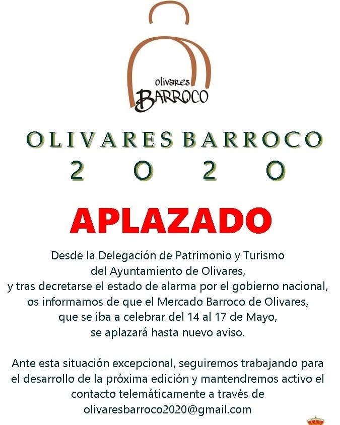 Desde la Delegación de Patrimonio y Turismo del Ayuntamiento de Olivares, y tras decretarse el estado de alarma por el gobierno nacional, os informamos de que el Mercado Barroco de Olivares, que se iba a celebrar del 14 al 17 de Mayo, se aplazará hasta nuevo aviso.