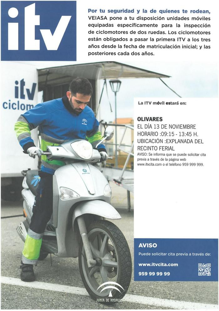 El Ayuntamiento de Olivares informa que el día 13 de noviembre, a partir de las 9:15 de la mañana y hasta las 13:45 horas, se encontrará en el Recinto Ferial de Olivares la Estación Móvil de la ITV de Ciclomotores para que puedan pasar la revisión a la que están obligados por ley.