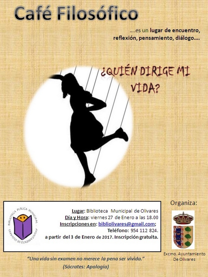 Abierto el plazo de inscripción para el CAFÉ FILOSÓFICO EN LA BIBLIOTECA PÚBLICA DE OLIVARES, que tendrá lugar el Viernes, 27 de enero a las 6 de la tarde. Precio: Gratis. Inscripción: Biblioteca Municipal. Plazas limitadas.