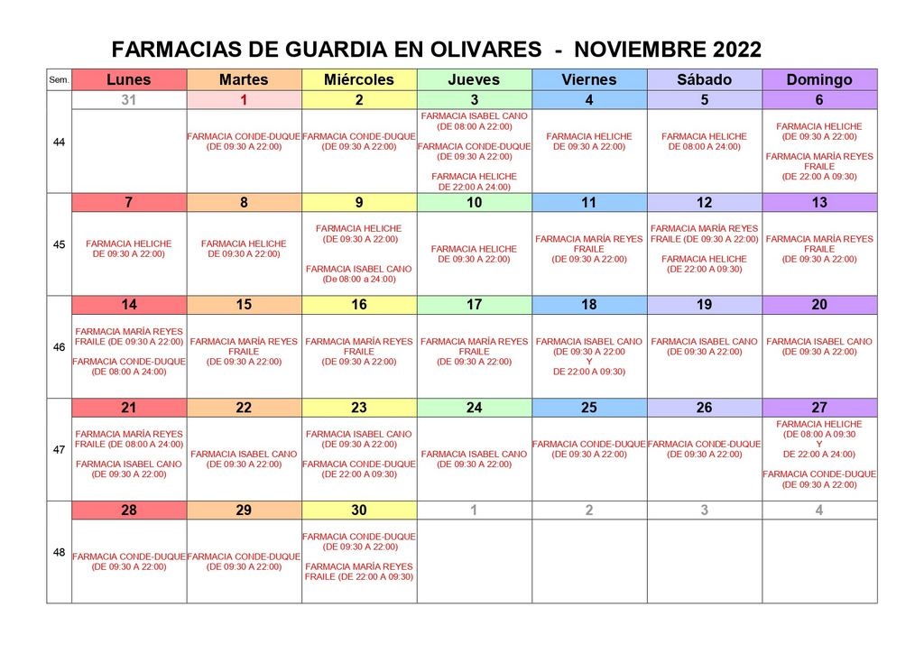 Para conocimiento general, se hace público el calendario de las farmacias de guardia en Olivares durante el mes de noviembre.