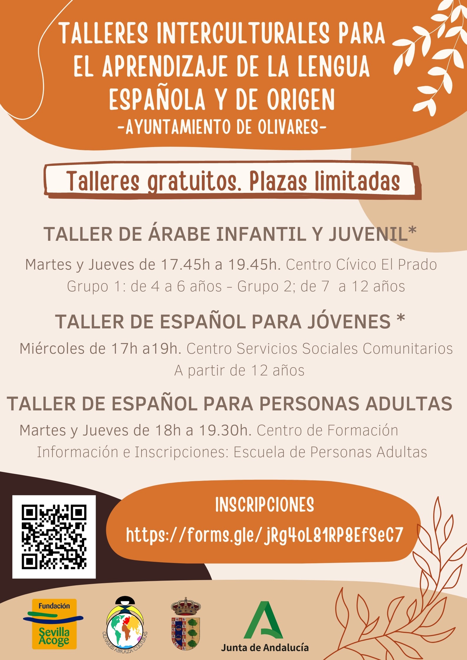 Desde el Programa ACERATE “OLIVARES ABRAZA CULTURAS” organizado por la Delegación de Bienestar Social en colaboración con la Fundación Sevilla Acoge y promovido por la Consejería de Igualdad, Políticas Sociales y Conciliación de la Junta de Andalucía se informa que se abre el plazo de inscripción de los Talleres Interculturales para el Aprendizaje de la Lengua Española y de Origen.