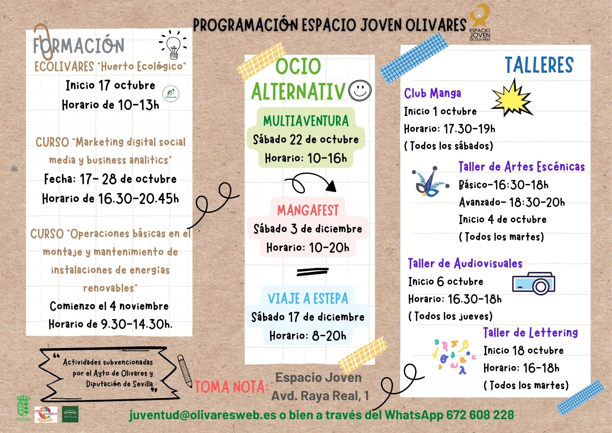 La Delegación de Juventud del Ayuntamiento de Olivares dinamiza a la población juvenil a través de actividades formativas y de ocio saludable. Están dirigidas principalmente a la población de entre 12 y 25 años de edad, y en su mayoría son gratuitos.