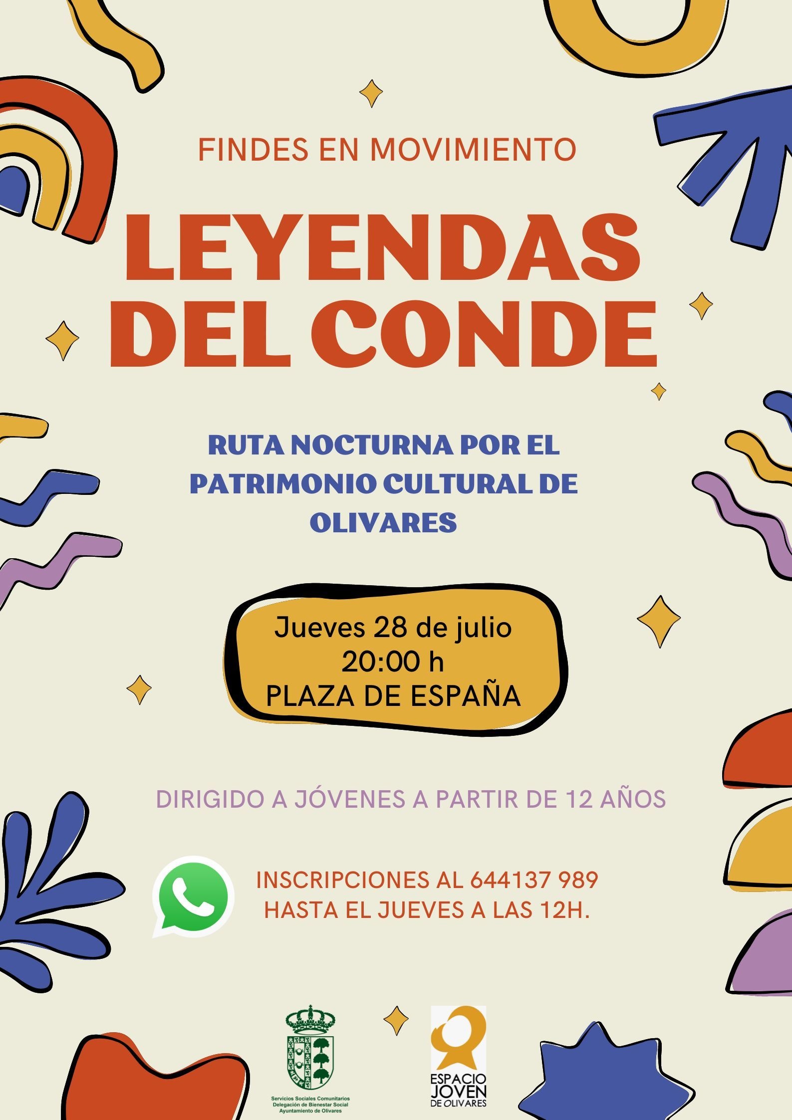Este jueves día 28 de julio a las 20.00h toda la población juvenil (a partir de 12 años), está invitada a participar en la Ruta Nocturna por el patrimonio cultural de Olivares “LEYENDAS DEL CONDE” organizada con la colaboración de la Oficina de Turismo.
