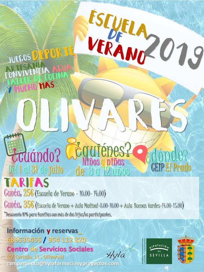 Desde el Área de Bienestar Social del Ayuntamiento de Olivares e Hyla Formación y Proyectos, le damos la bienvenida un año más al proyecto de dinamización de la infancia promovido por la Diputación de Sevilla: Escuela de Verano, que abrirá sus puertas durante el mes de julio para participantes de entre 3 años (siempre que hayan cursado primer ciclo de infantil) y 12 años, en el CEIP El Prado e instalaciones municipales.