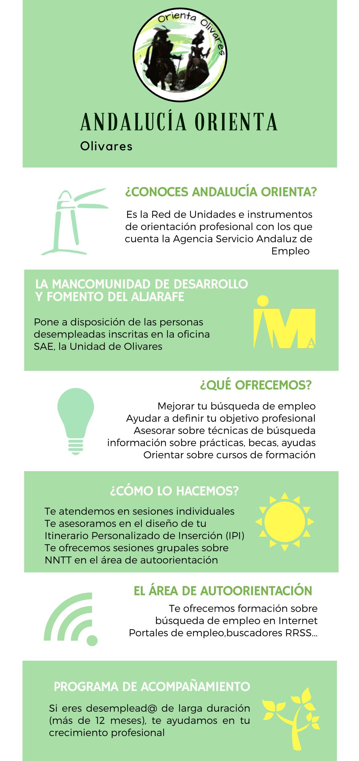 En estrecha colaboración con la Oficina SAE de Sanlúcar la Mayor y con los distintos servicios municipales del Ayuntamiento de Olivares, en esta Unidad de Orientación se tendrá acceso a todo tipo de asesoramiento e información durante el periodo de búsqueda de empleo mediante la identificación y desarrollo de las competencias profesionales y transversales de cada persona. Además, se podrá consultar información relativa a estudios oficiales, cursos de formación y prácticas laborales.