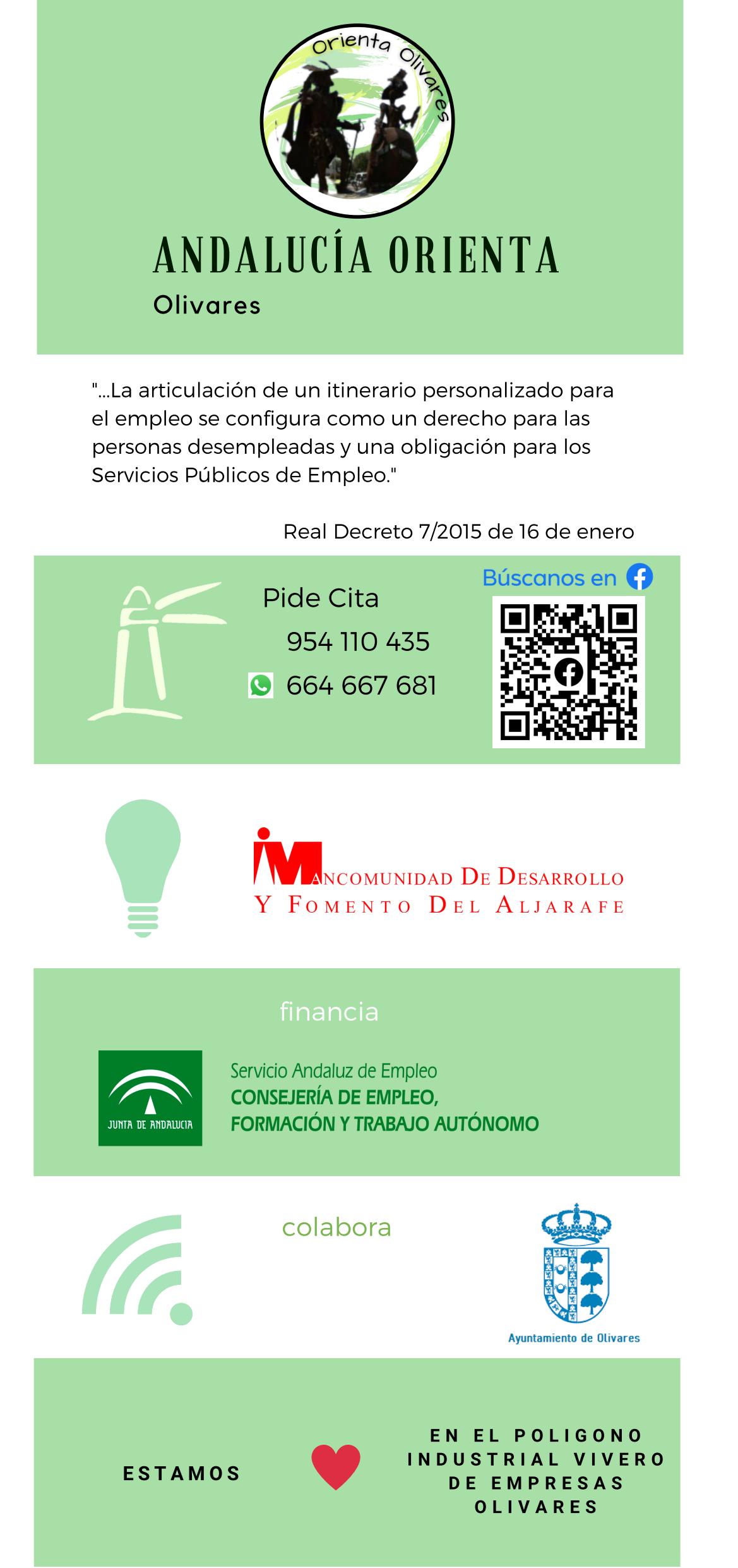 Para contactar con Andalucía Orienta Olivares puedes hacerlo mandando un WhatsApp o llamando al 664 66 76 81. También es posible contactar mediante llamada telefónica al siguiente número de teléfono 954 11 04 35. Si prefieres hacerlo de forma escrita, dirígete al perfil de Facebook “Andalucía Orienta Olivares”.