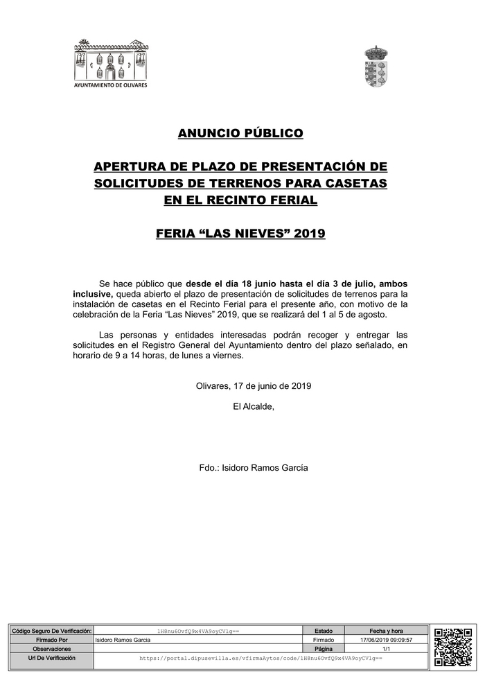Del 18 de junio al 3 de julio, ambos inclusive, queda abierto el plazo de presentación de solicitudes de terrenos para la instalación de casetas en el Recinto Ferial para el presente año, con motivo de la celebración de la Feria "Las Nieves" 2019, que se realizará del 1 al 5 de agosto.
