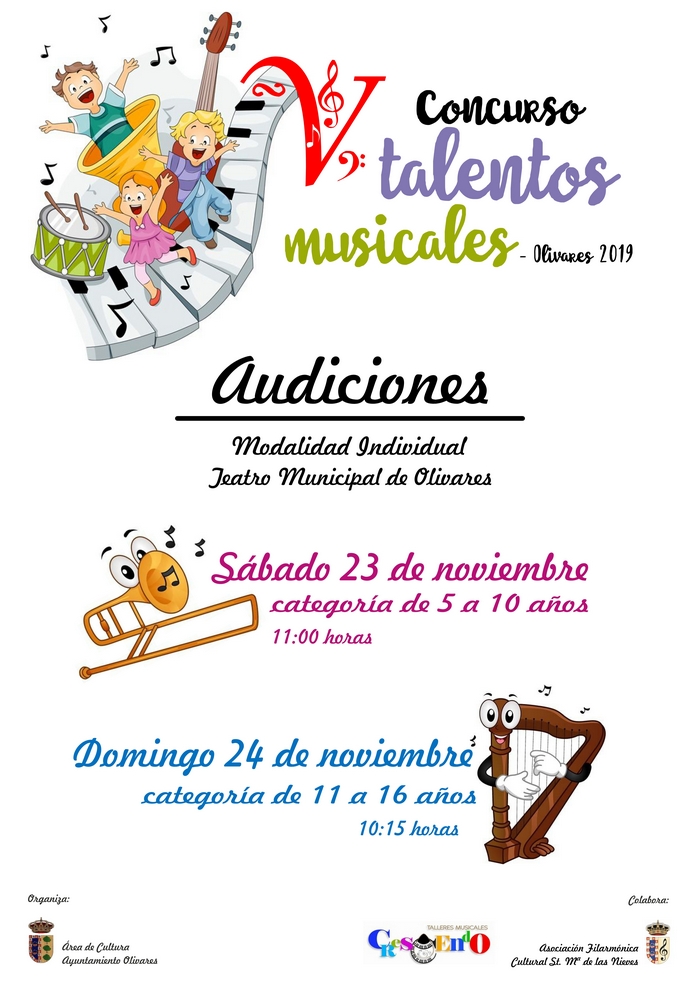 Los días 23 y 24 de noviembre se celebrará, en el Teatro Municipal, el V CONCURSO DE TALENTOS MUSICALES-OLIVARES 2019. Concursarán 23 participantes entre 5 y 16 años en la Modalidad Individual.