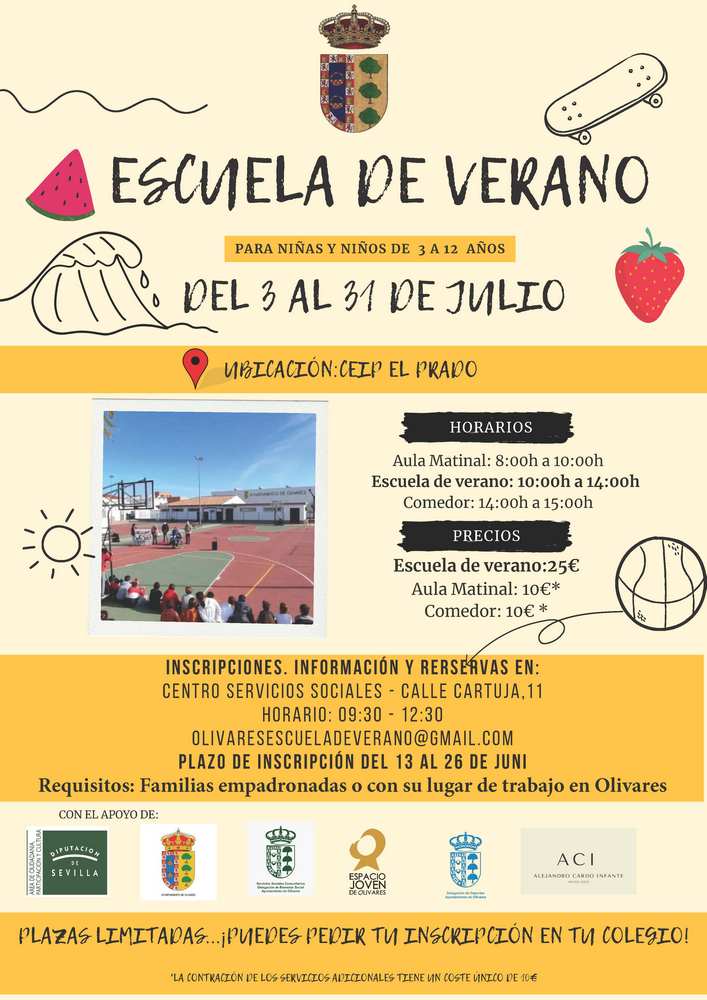 La Escuela de Verano Municipal se llevará a cabo durante el mes de julio en el CEIP “El Prado” ofreciendo un espacio de participación infantil lúdico y diverso. Este proyecto va dirigido a menores de 3 a 12 años y pueden presentar la solicitud en el Centro de Servicios Sociales Comunitarios, sito en C/ Cartuja, 11. El precio es de 25€ por participante y 10€ más si solicita los servicios de aula matinal y/o-aula de buenas tardes-comedor (canasto). A las familias que presenten más de 2 solicitudes se le aplicará un descuento del 10% del coste de la Escuela de Verano.