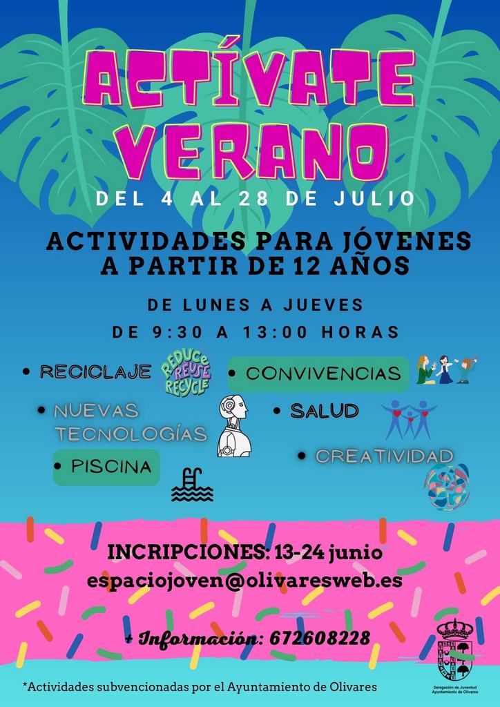 Comenzamos el 4 de julio y el periodo de inscripción se abre desde el 13 al 24 de junio (ambos incluidos) en el email espaciojoven@olivaresweb.es