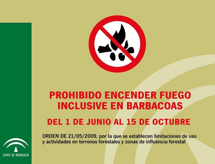 1.- Que según la Orden de 21 de mayo de 2009, de la Consejería de Medio Ambiente, por la que se establecen limitaciones de usos y actividades en terrenos forestales y zonas de influencia forestal (franja de 400 metros circundantes) SE PROHÍBE EL USO DEL FUEGO DEL 1 DE JUNIO AL 15 DE OCTUBRE en las mismas, y en particular:
