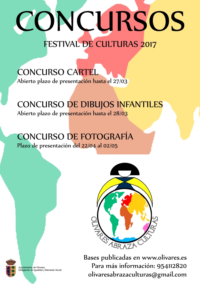 Las bases reguladoras de los premios están disponibles a continuación, aunque si desea ampliar la información puede contactar con el Comité Organizador mediante el correo electrónico olivaresabrazaculturas@gmail.com, o en el Centro de Servicios Sociales Comunitarios. 954112820
