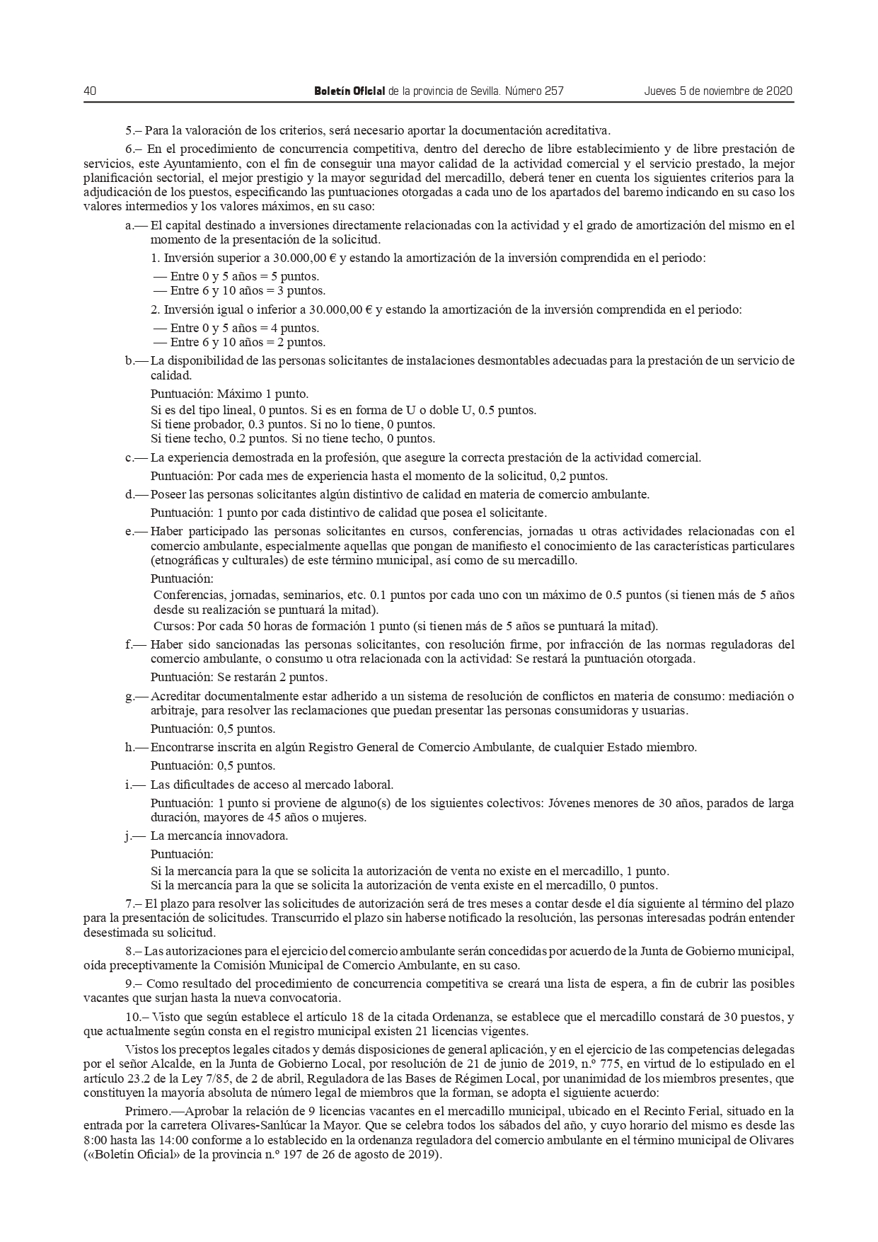 La concesión de la licencia para el puesto en el mercadillo se realizará en función de la puntuación obtenido, teniendo en cuenta los criterios establecidos en el apartado 6 del acuerdo de publicación, que se puede obtener en la cartelería adjunta.