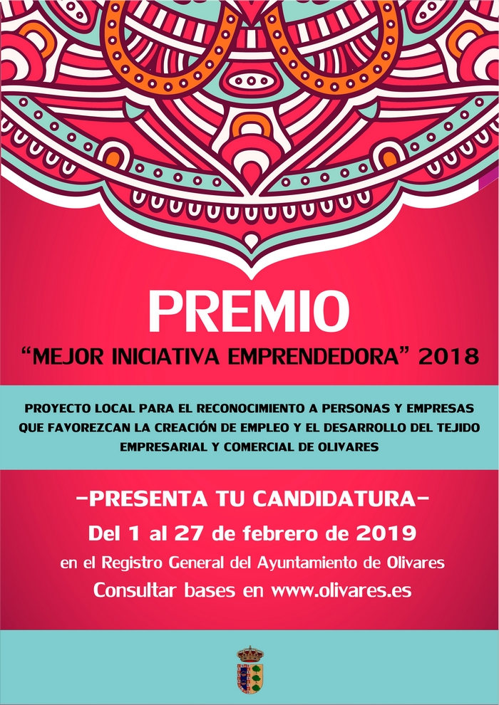El Ayuntamiento de Olivares ha aprobado el pasado 29 de enero la convocatoria anual del Premio a la Mejor Iniciativa Emprendedora, correspondiente al año 2018, mediante el cual se otorga una distinción especial al esfuerzo y al dinamismo de personas y entidades sociales que hagan una especial contribución a la creación y reparto de riqueza, a la creación de empleo y que, en definitiva, favorezcan el desarrollo del tejido empresarial y comercial de Olivares.