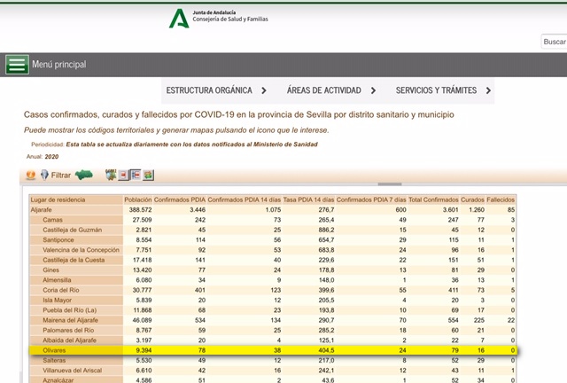 Desde el Ayuntamiento de Olivares se hace pública la información oficial de la incidencia del COVID-19 en la población de nuestro municipio. Esta información oficial es la publicada por la Consejería de Salud y Familias de la Junta de Andalucía en la siguiente web :
