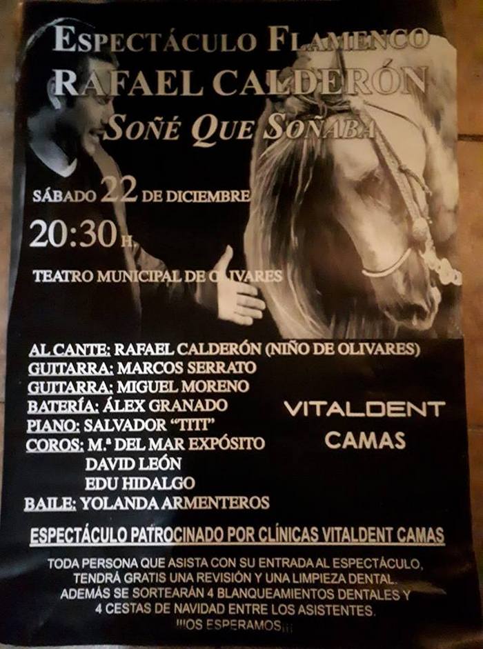 El día 22 de diciembre, a las 20:30 horas, en el Teatro Municipal de Olivares Rafael Calderón presenta su espectáculo flamenco "Soñé que soñaba", patrocinado por el Ayuntamiento de Olivares y Clínica Vitaldent (Camas).