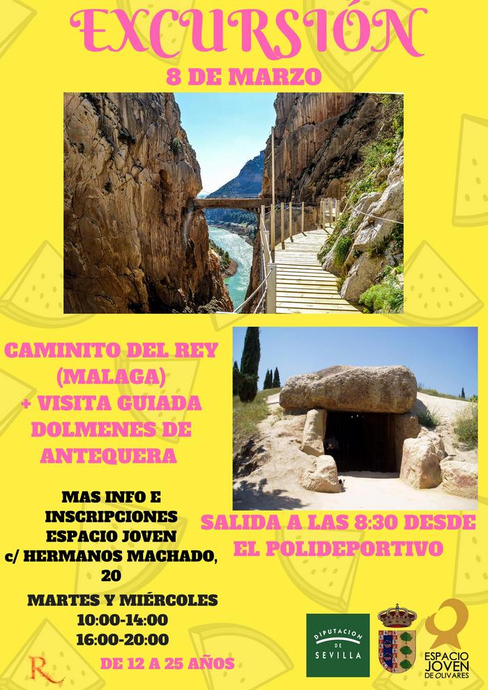 El Área de Juventud del Ayuntamiento de Olivares pone en marcha un día de convivencia para los/as jóvenes del municipio entre 12 y 25 años a disfrutar el próximo 8 de marzo de una jornada de senderismo en el Caminito del Rey y los Dólmenes de Antequera (Málaga).