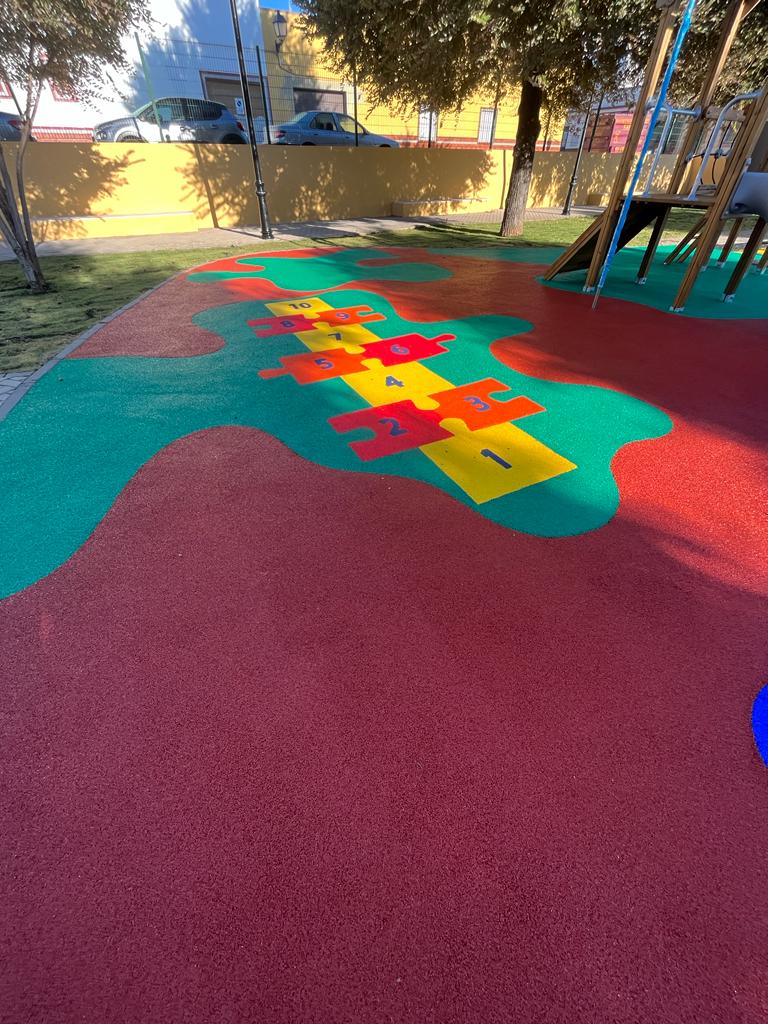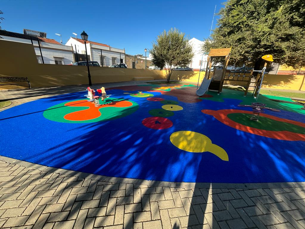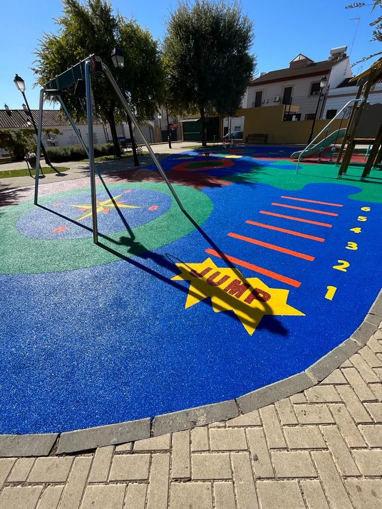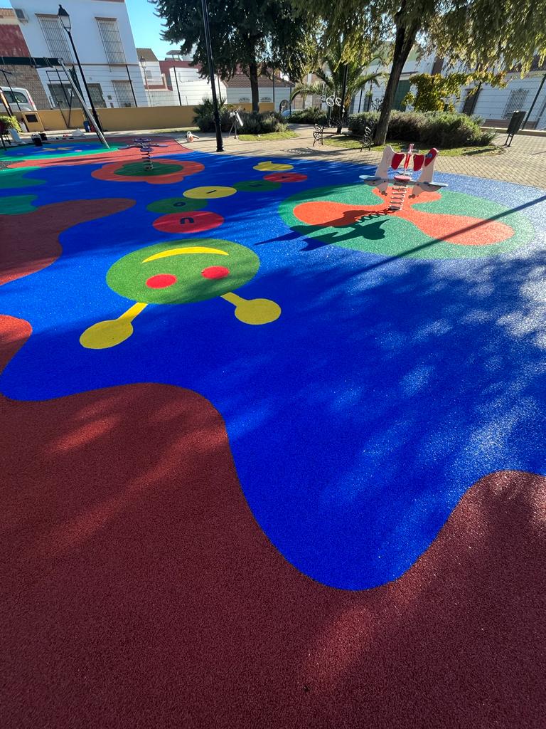 En la Plaza del Guadalquivir se ha sustituido totalmente tanto el pavimento de la zona de juegos infantiles, que anteriormente estaba ejecutado en losetas de caucho, por la ejecución en distintos colores de toda la zona de juegos en caucho continuo, así como la instalación de césped natural.