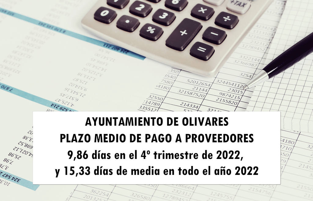 Según la información remitida por la Intervención Municipal del Ayuntamiento de Olivares, el período medio de pago a los proveedores durante el cuarto trimestre de 2022, se ha situado en los 9,86 días, el más bajo de todo el año, y uno de los más bajos de la serie histórica.