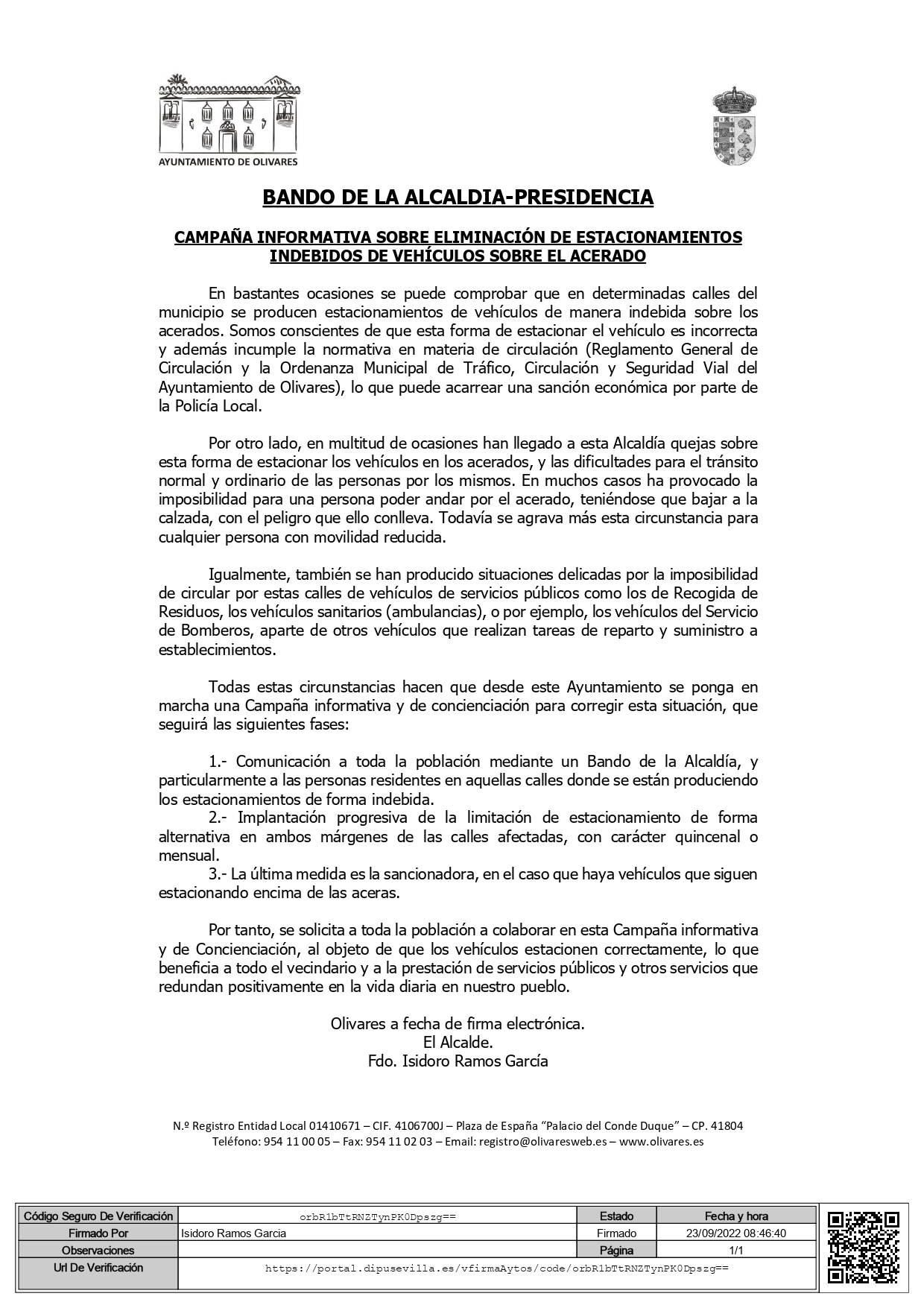 El Ayuntamiento de Olivares pone en marcha una Campaña informativa sobre la necesaria eliminación de los estacionamientos indebidos de vehículos sobre los acerados, teniendo en cuenta la proliferación de este tipo de comportamientos en determinadas vías públicas del municipio.