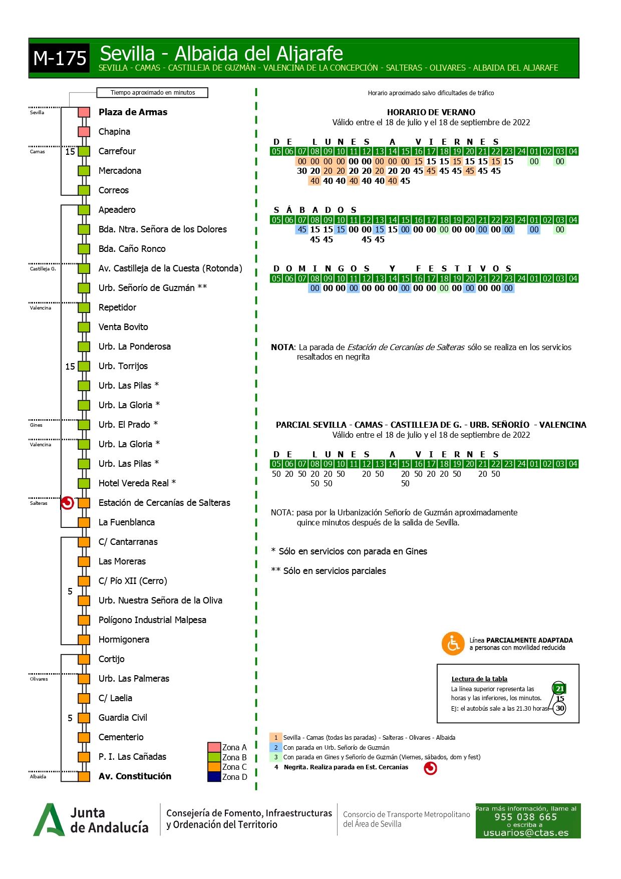 La línea de autobuses M-175 discurre por los municipios de Sevilla, Camas, Castilleja de Guzmán, Valencina de la Concepción, Salteras, Olivares y Albaida del Aljarafe, en su recorrido de ida y vuelta.
