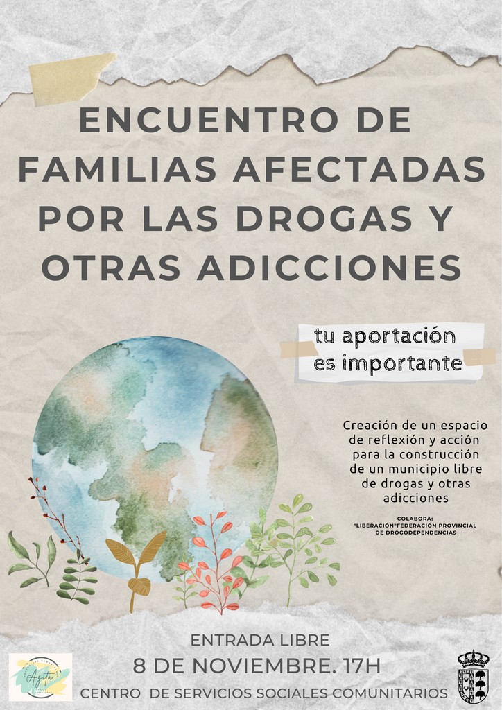 El martes 8 de noviembre a las 17h en el Centro Municipal de Servicios Sociales Comunitarios tendrá lugar un encuentro dirigido a familias afectadas por las drogas y otras adicciones organizado desde el Programa Municipal para la prevención comunitaria contra las drogas y otras adicciones "AGITA" impulsado por la Delegación de Bienestar Social del Ayuntamiento.