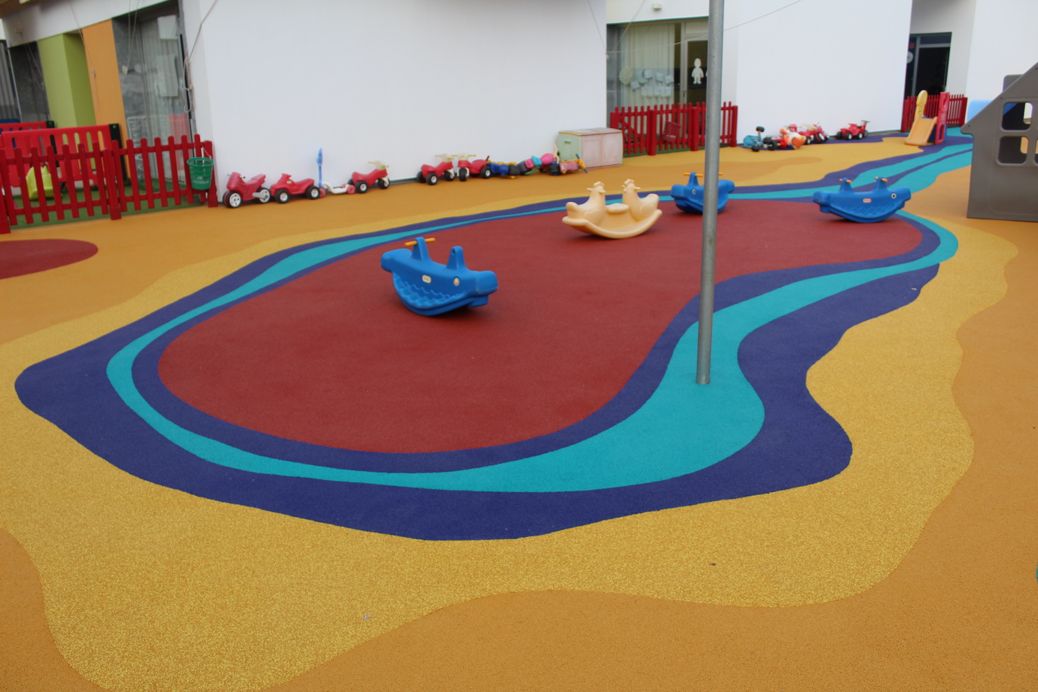 Las obras de instalación del pavimento en el suelo del patio de la escuela infantil “Los Tambores” se ha llevado con una extensión aproximada de doscientos metros cuadrados. El tiempo de ejecución de dichas obras ha sido de una semana. La instalación se ha hecho “in situ”, es decir, no son piezas de caucho que procedan de fábricas ya realizadas.