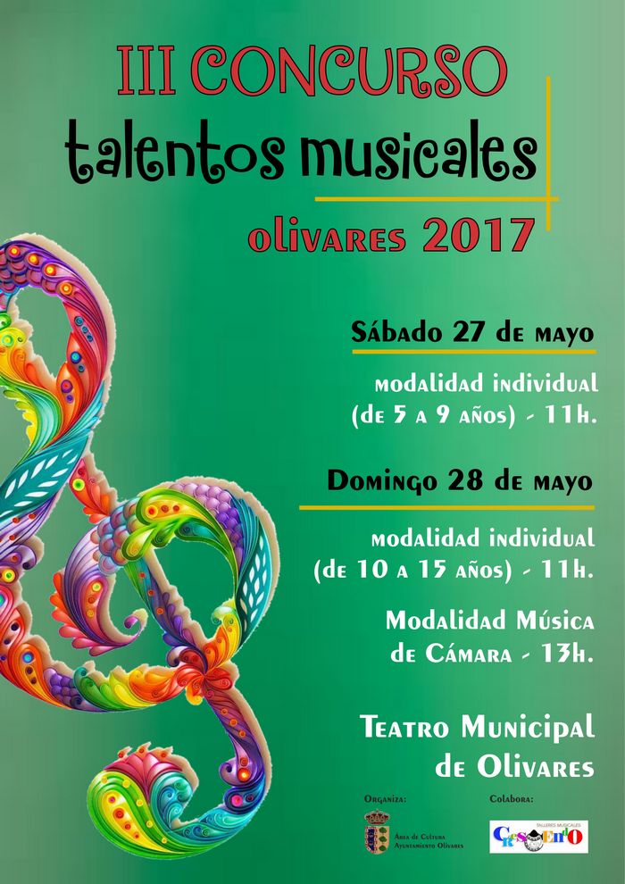 Los días 27 y 28 de mayo se celebrará, en el Teatro Municipal, el III CONCURSO DE TALENTOS MUSICALES-OLIVARES 2017. En la Modalidad Individual concursarán cuarenta y dos participantes entre 5 y 15 años. Y en la 2ª Modalidad Música de Cámara serán seis los grupos que se presentan.