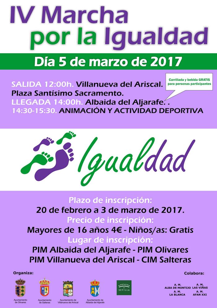 El próximo día 5 de Marzo 2017 tendrá lugar esta actividad que se realiza a nivel comarcal entre los ayuntamientos de los municipios de Olivares, Albaida del Aljarafe, Salteras y Villanueva del Ariscal, en conmemoración al Día Internacional de la Mujer y en homenaje a la igualdad real, entre hombres y mujeres en nuestra sociedad.