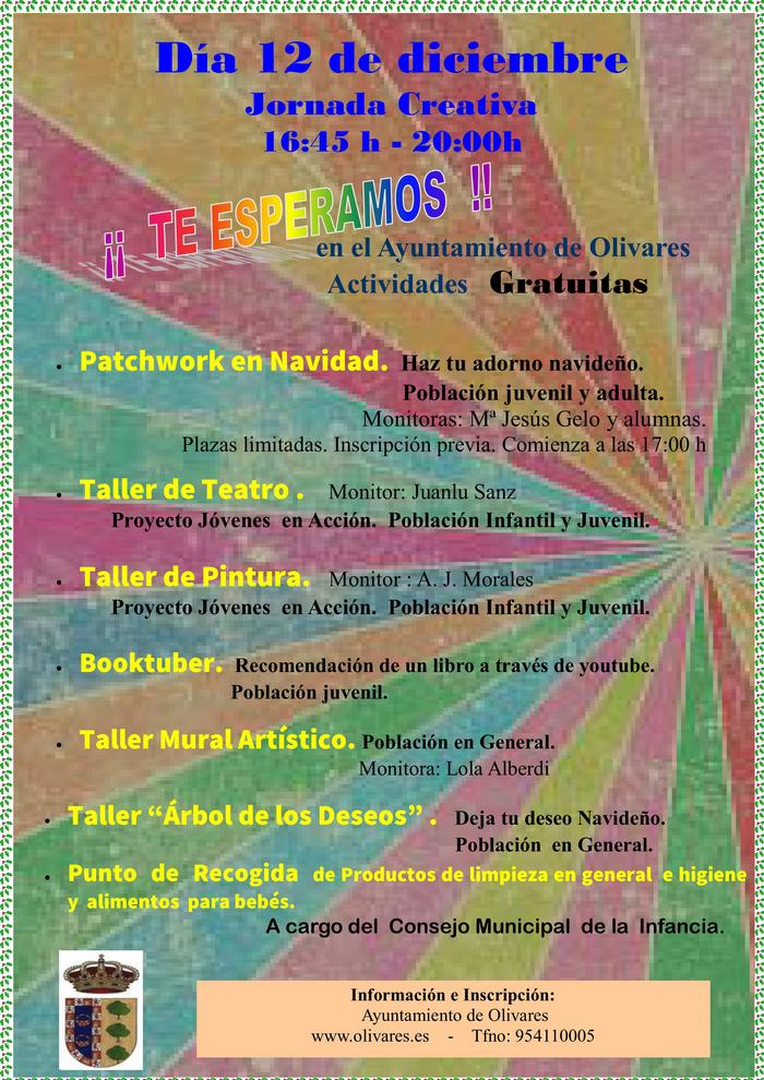 El próximo martes día 12 de diciembre desde las 16:45 h hasta las 20:00 h aproximadamente, tendrá lugar las "Jornadas Creativas" en el Ayuntamiento de Olivares, que constarán de las siguientes actividades.