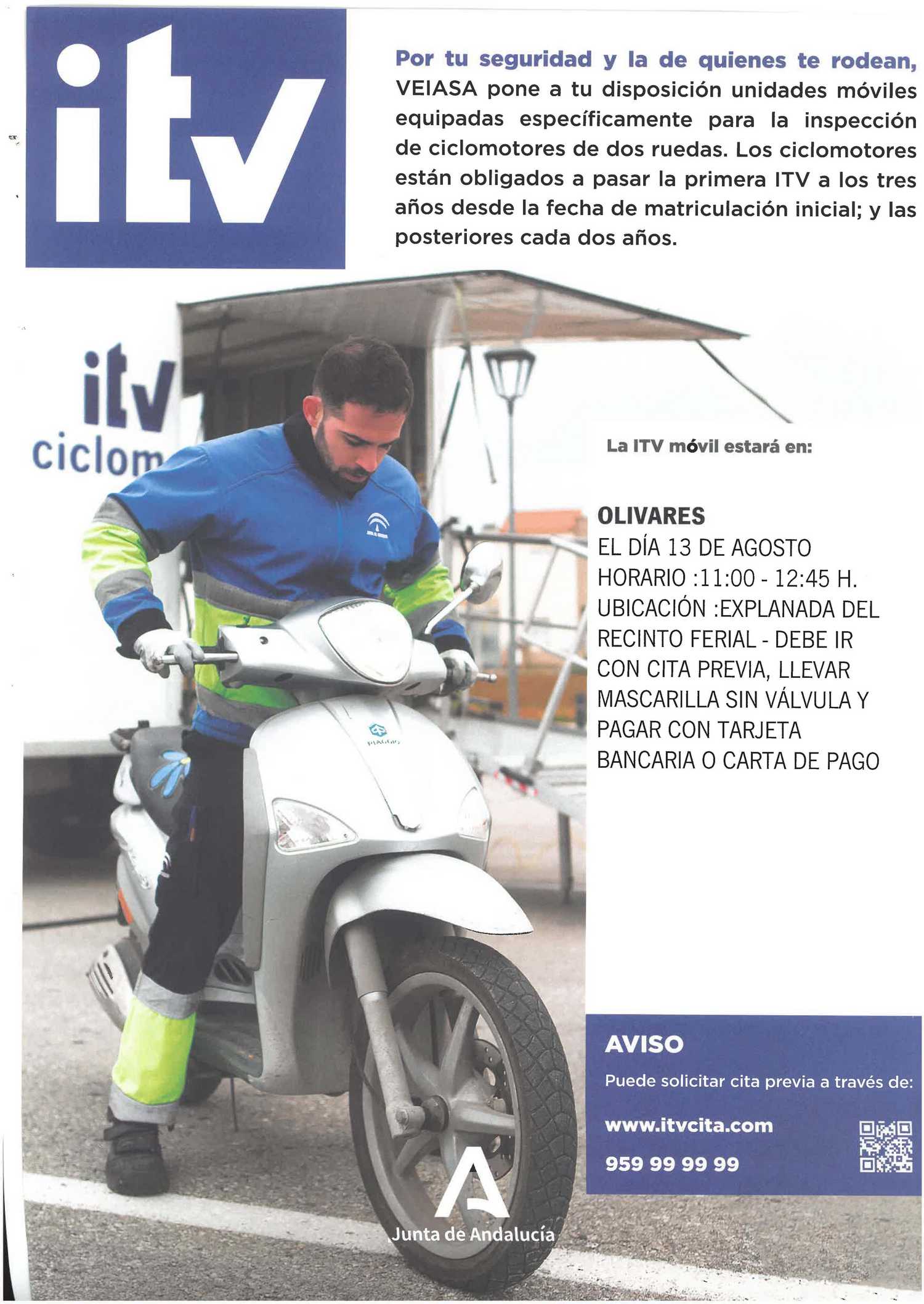 El Ayuntamiento de Olivares informa que el día 13 de agosto, a partir de las 11 de la mañana y hasta las 12:45 horas, se encontrará en el Recinto Ferial de Olivares la Estación Móvil de la ITV de ciclomotores de 2 ruedas para que puedan pasar la revisión a la que están obligados por ley.