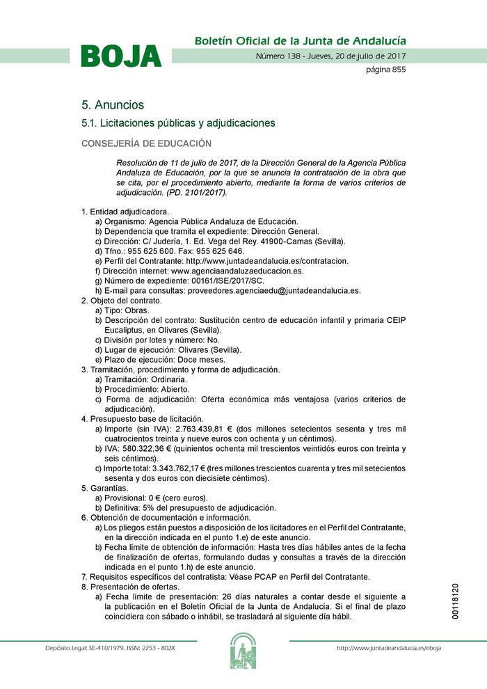 La Consejería de Educación ha publicado en el Boletín Oficial de la Junta de Andalucía (BOJA) de ayer jueves 20-7-2017, la licitación de las obras de sustitución del Colegio de Educación Infantil y Primaria (CEIP) 'Los Eucaliptus' de Olivares. Según la información facilitada por la propia Consejería en su página web, este nuevo Centro beneficiará a cerca de 400 alumnos y alumnas matriculados actualmente en el centro, y cuenta con un presupuesto de 3.343.762 euros y un plazo de ejecución previsto de doce meses.