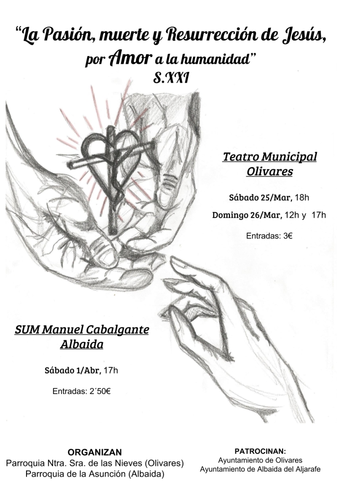 El día 25 de marzo a las 18 horas y el día 26 de marzo a las 12 y 17 horas se representará en el Teatro Municipal de Olivares "La Pasión, Muerte y Resurrección de Jesús, por Amor a la Humanidad. S.XXI", organizada por la Parroquia Ntra Sra de las Nieves de Olivares y patrocinada por el Área de Cultura del Ayuntamiento de Olivares. Entrada 3 euros.