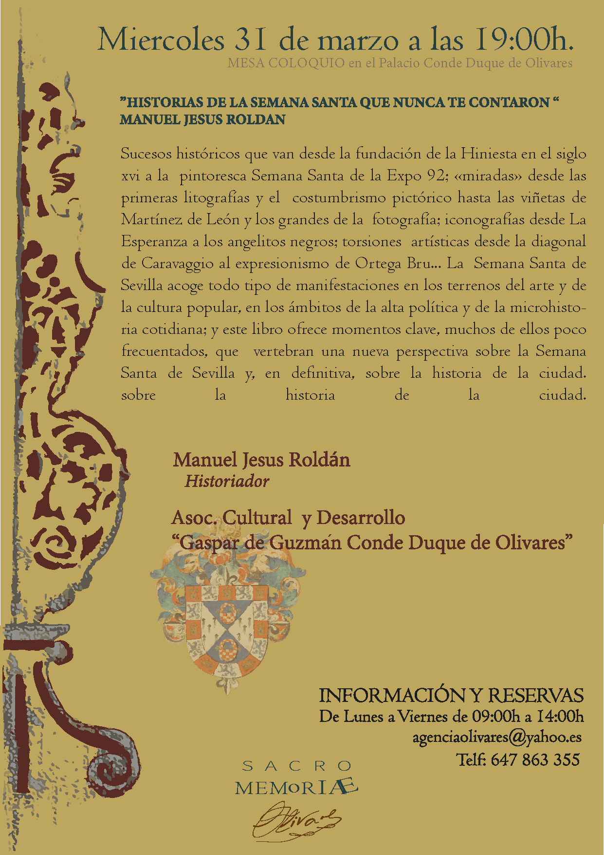 - Miércoles 31 de marzo: “La historia de la Semana Santa que nunca te contaron”. La Asociación Cultural “Gaspar de Guzmán Conde Duque de Olivares” moderará el acto. Contará con la presencia de: