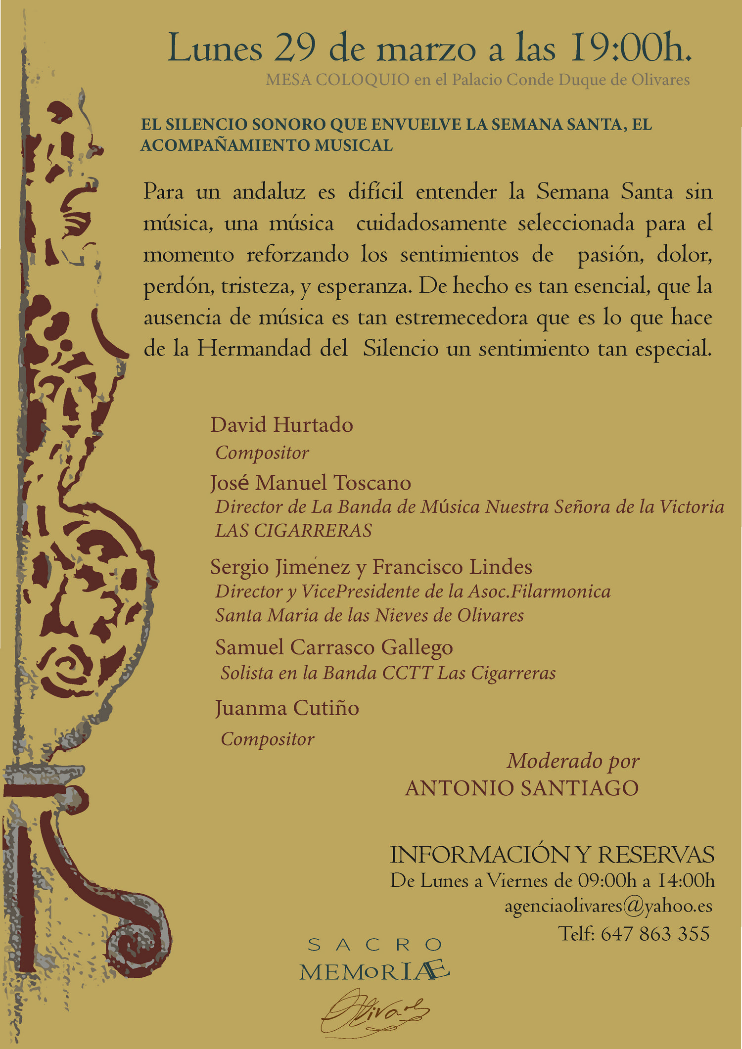 - Lunes 29 de marzo: “El silencio sonoro que envuelve la Semana Santa. El acompañamiento musical”. Antonio Santiago moderará el acto. Contará con la presencia de: