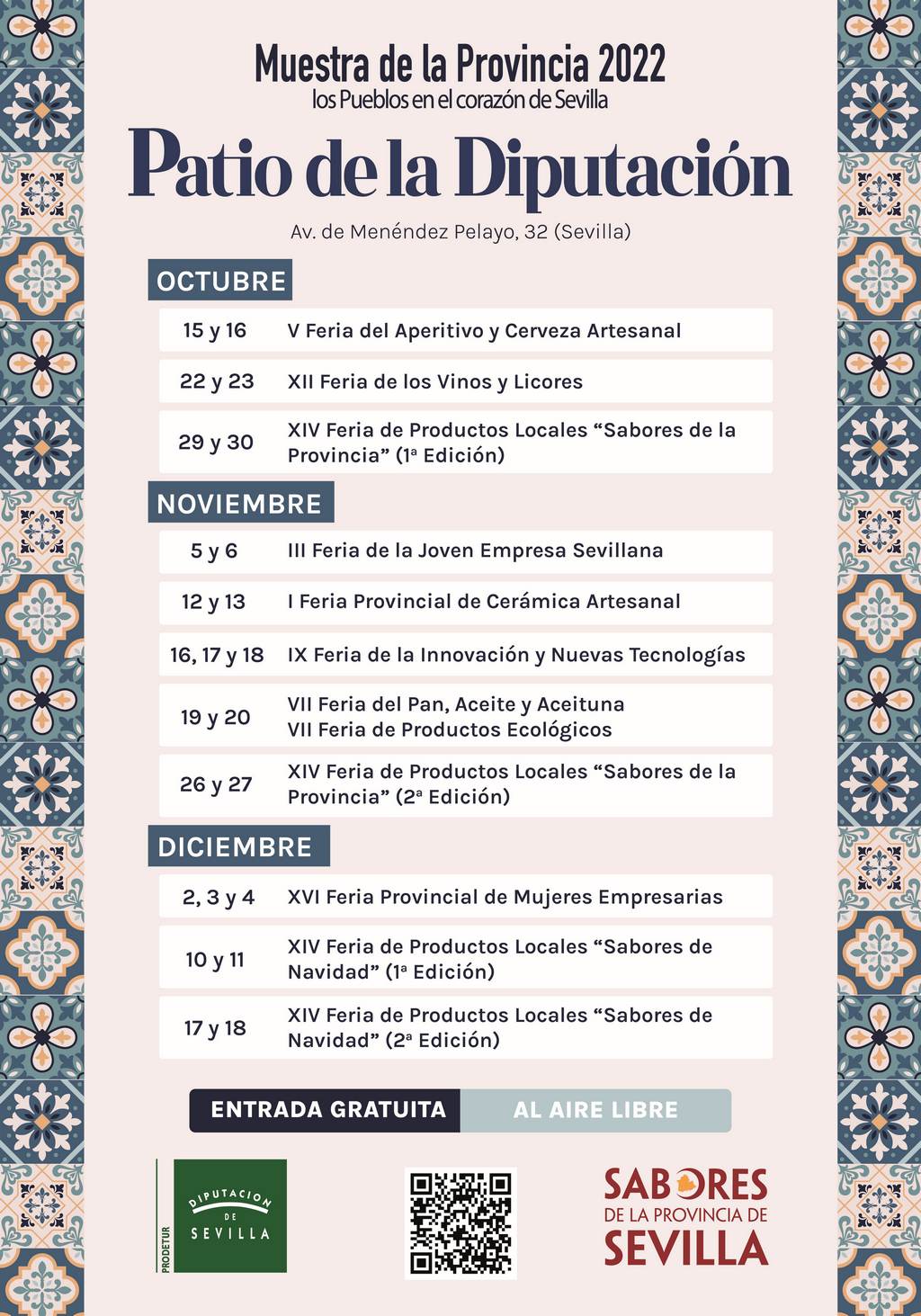Entre los meses de octubre a diciembre de 2022 se desarrollará una nueva edición de la Muestra de la Provincia de Sevilla en el Patio de la Diputación, organizada por Prodetur, tras el éxito de la edición anterior a la que asistieron casi 30.000 visitantes. Como novedad contará con 11 ferias y una zona de escenario más amplia, con una imagen renovada, en la que se desarrollará un amplio programa de actividades de dinamización.