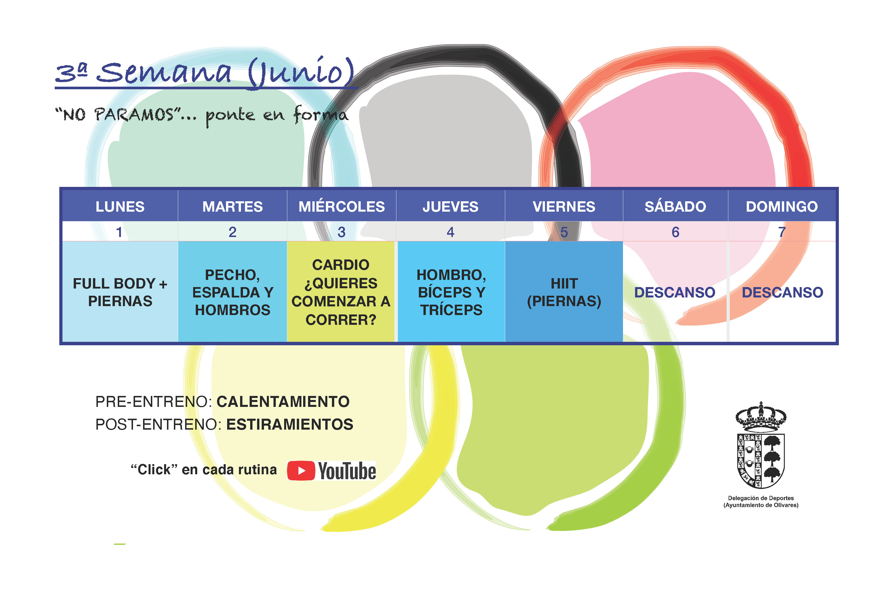 La Delegación de Deportes del Ayuntamiento de Olivares, presenta la 3ª SEMANA del calendario de entrenamiento, puedes ver los videos pinchando cada día en el pdf adjunto.