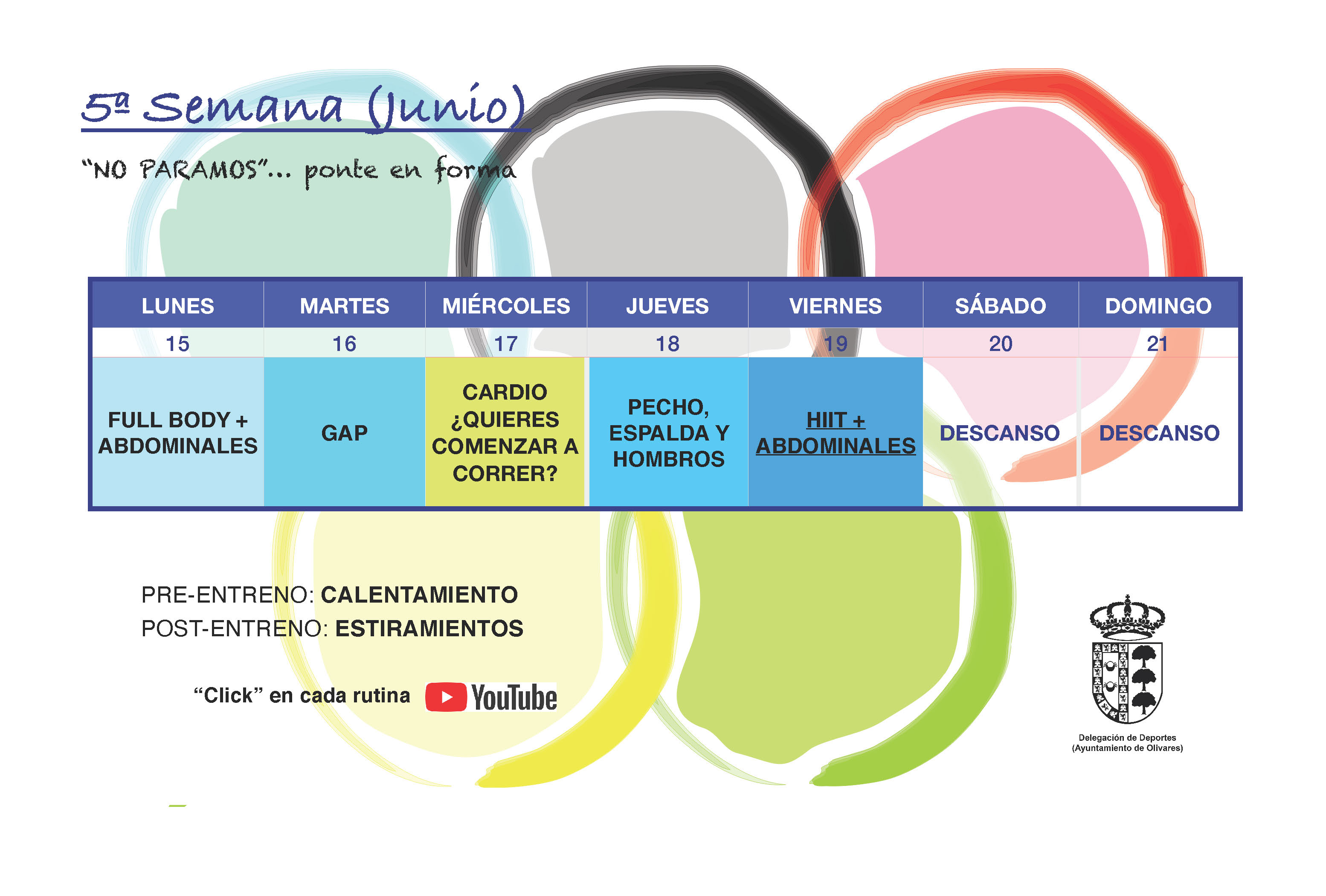 La Delegación de Deportes del Ayuntamiento de Olivares, presenta el QUINTO CALENDARIO SEMANAL de entrenamiento, para ver los videos hay que pinchar en cada día en el pdf adjunto.
